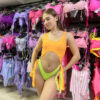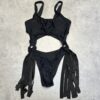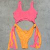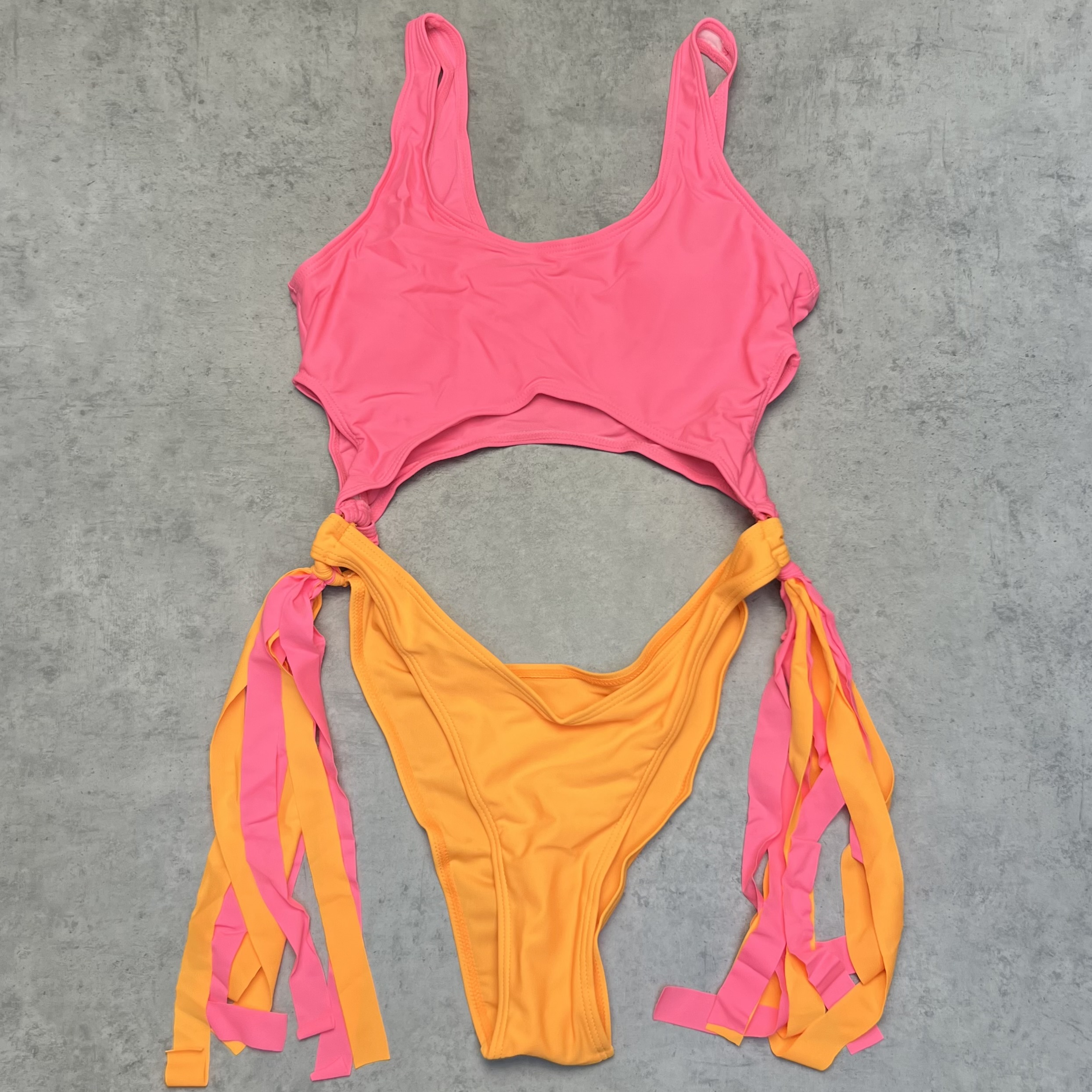 Слитный купальник. Верх маечка, классические бретели, есть вкладыши. Низ бикини завышенные по бедру. Вырез на спинке и животике, декоративные кисти на бёдрах.