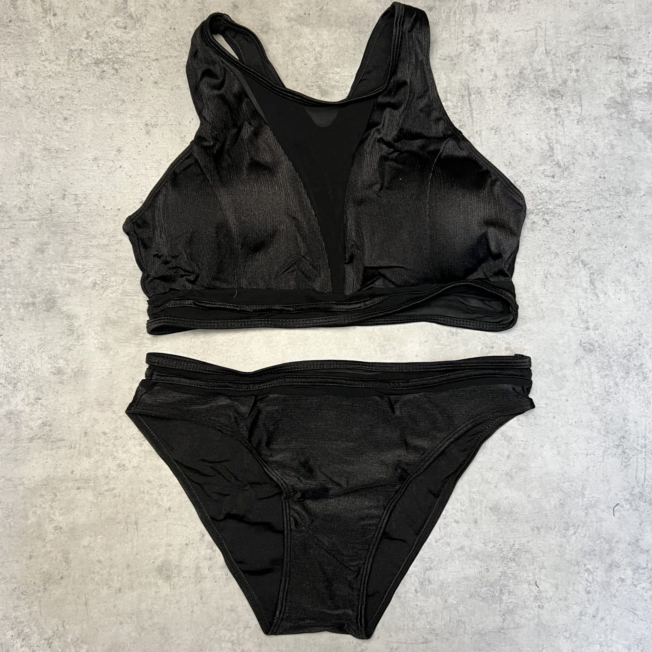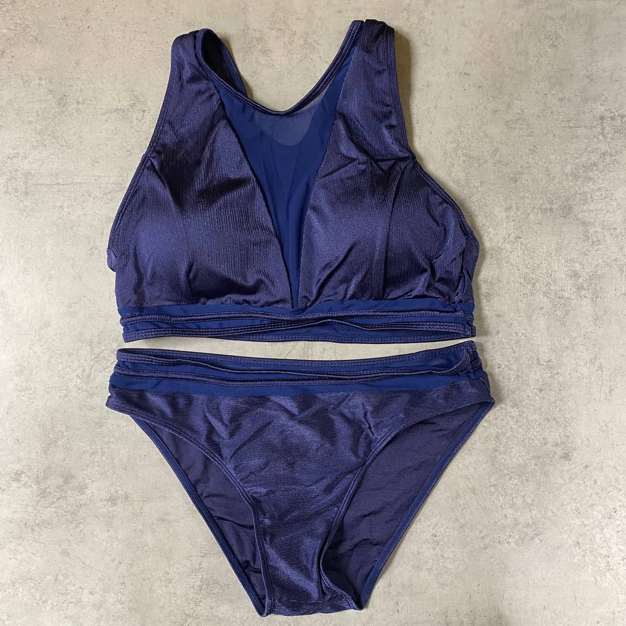 Раздельный купальник. Верх топ с декоративной сеткой на груди, есть вкладыши. Низ завышенные трусики.