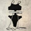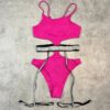 Слитный купальник на регулируемых бретелях, есть вкладыши, на ногах подвязки.