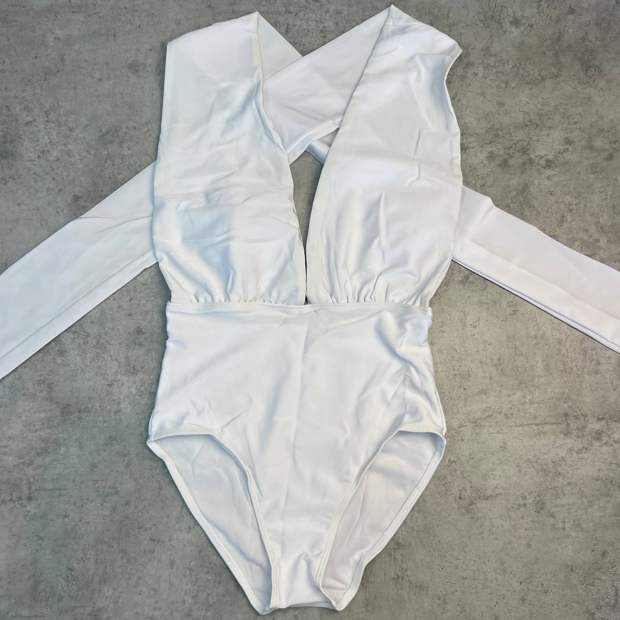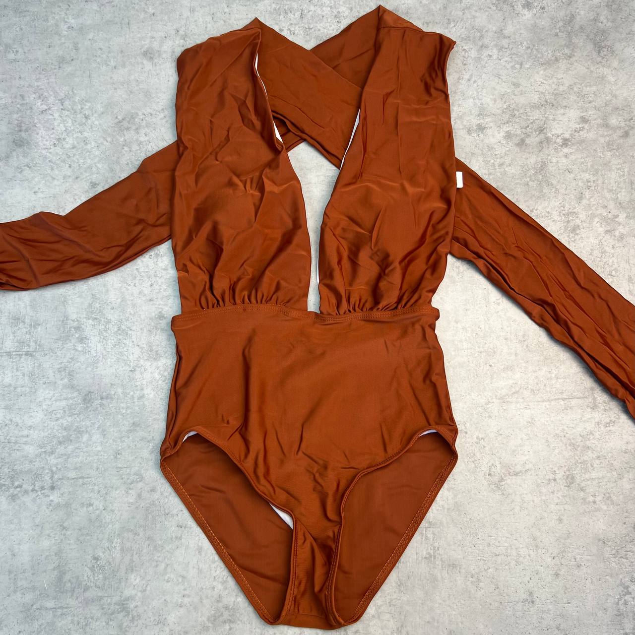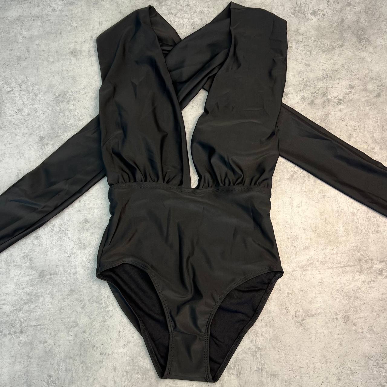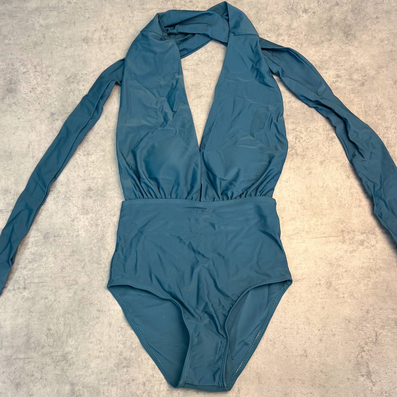 Слитный купальник с длинными завязками вокруг талии и глубоким вырезом в зоне декольте, есть вкладыши.