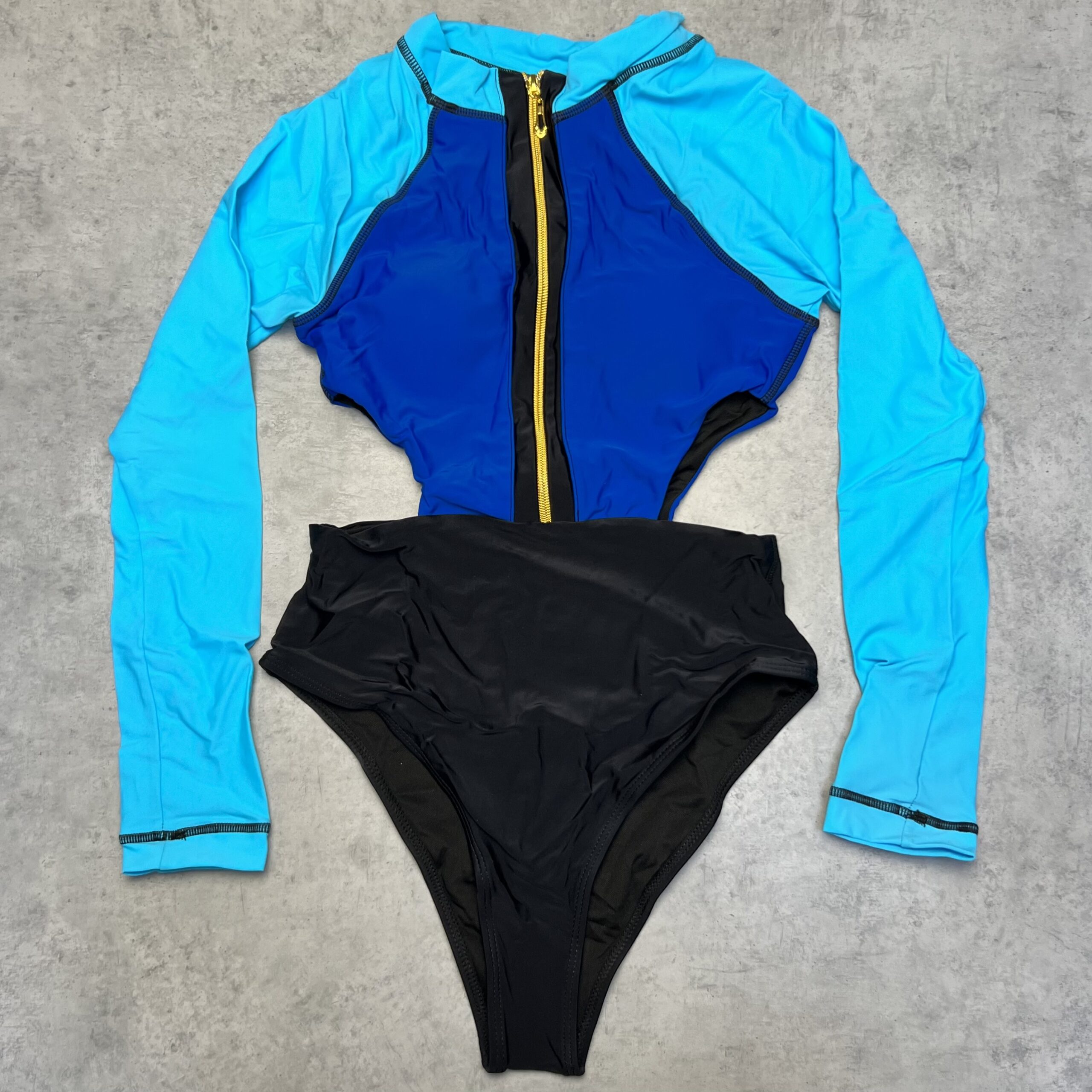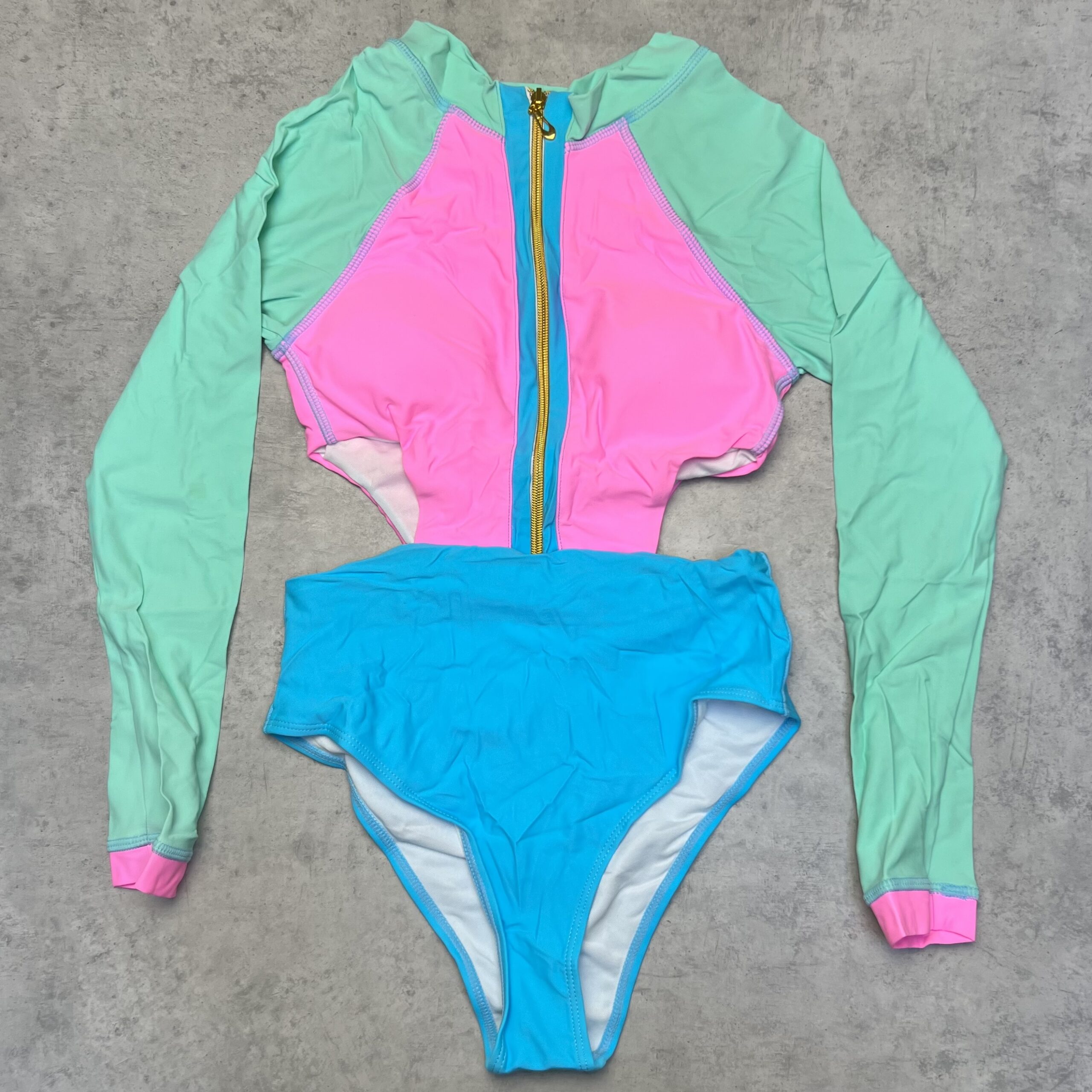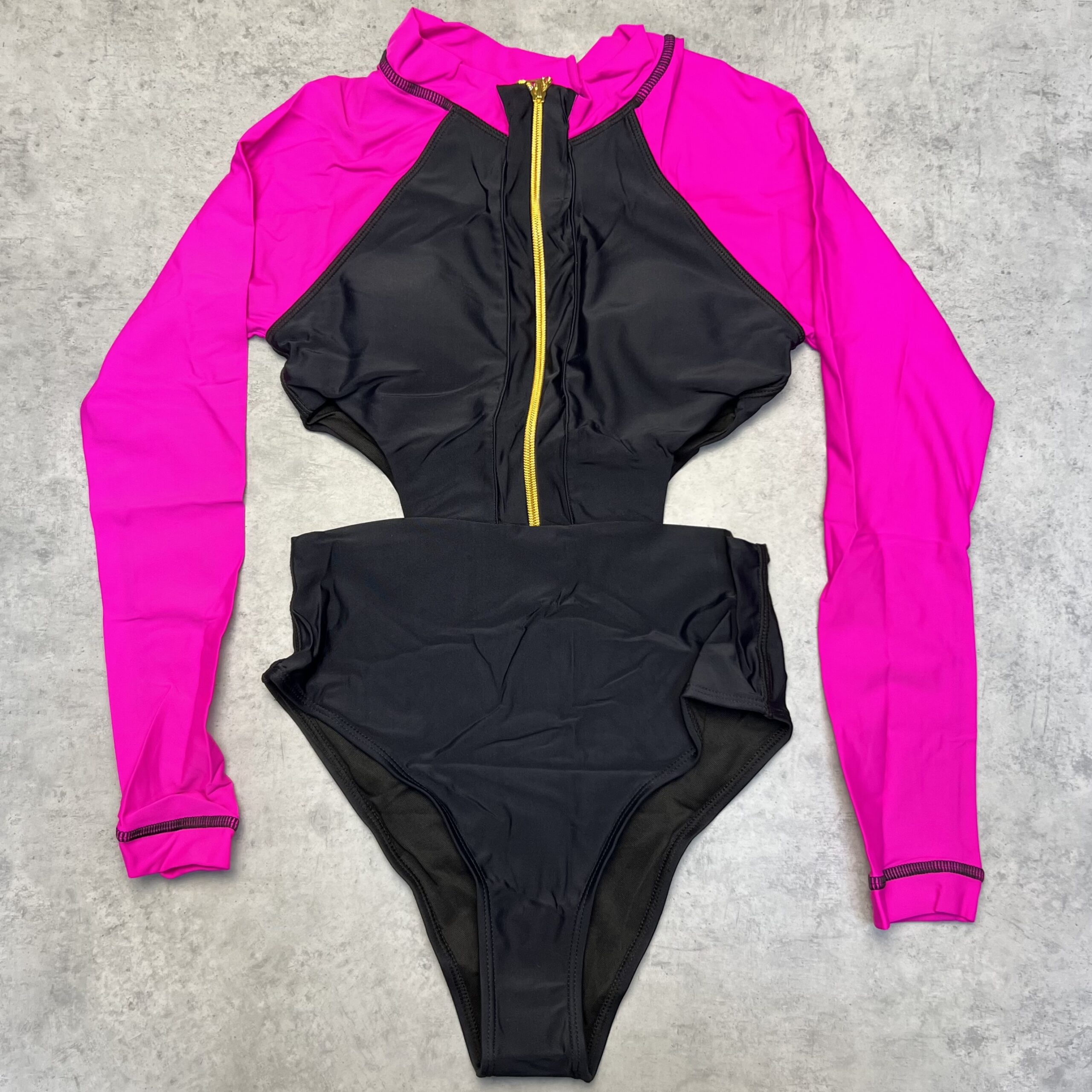 Слиный купальник с длинными рукавами, вырезами на боках и молнией спереди, есть вкладыши.