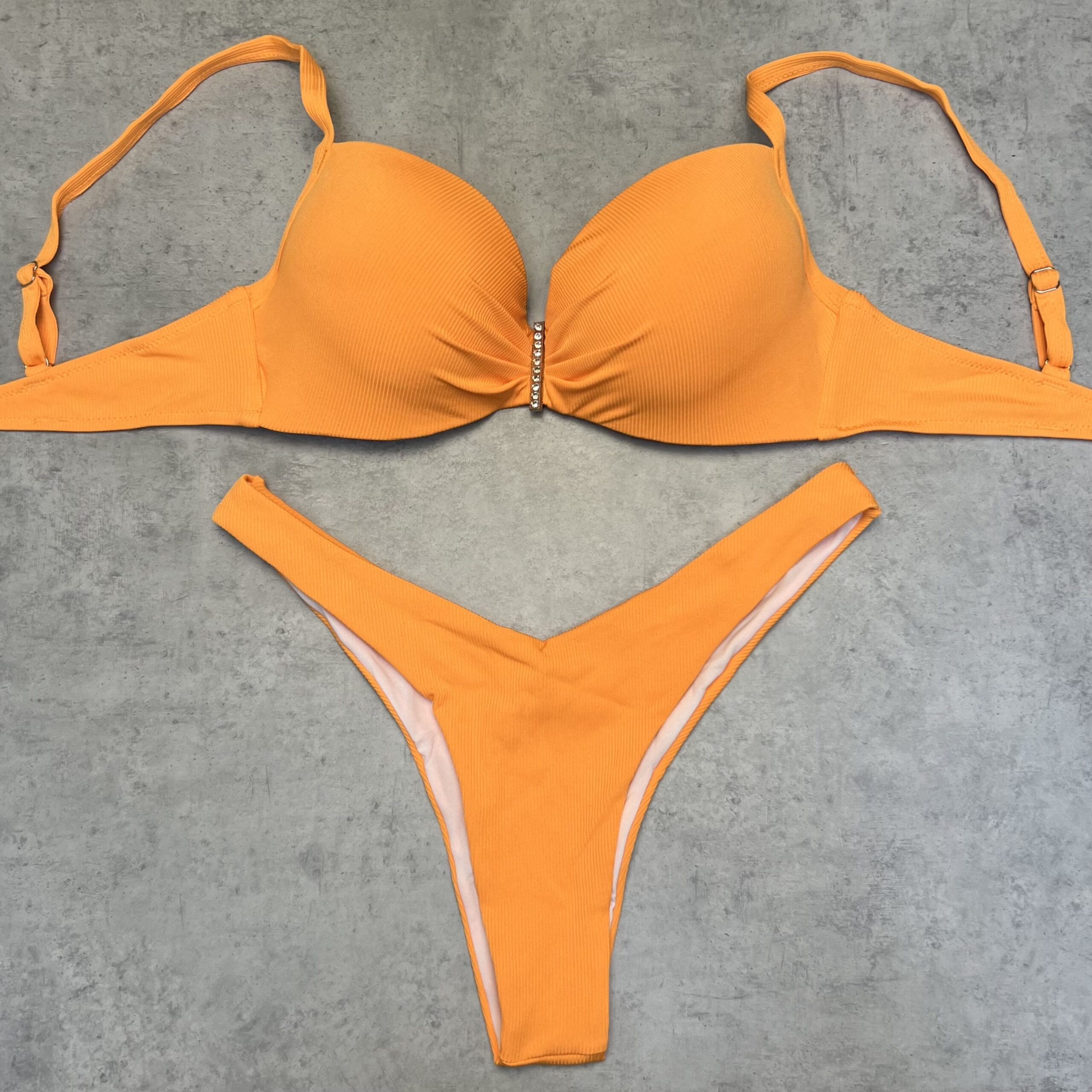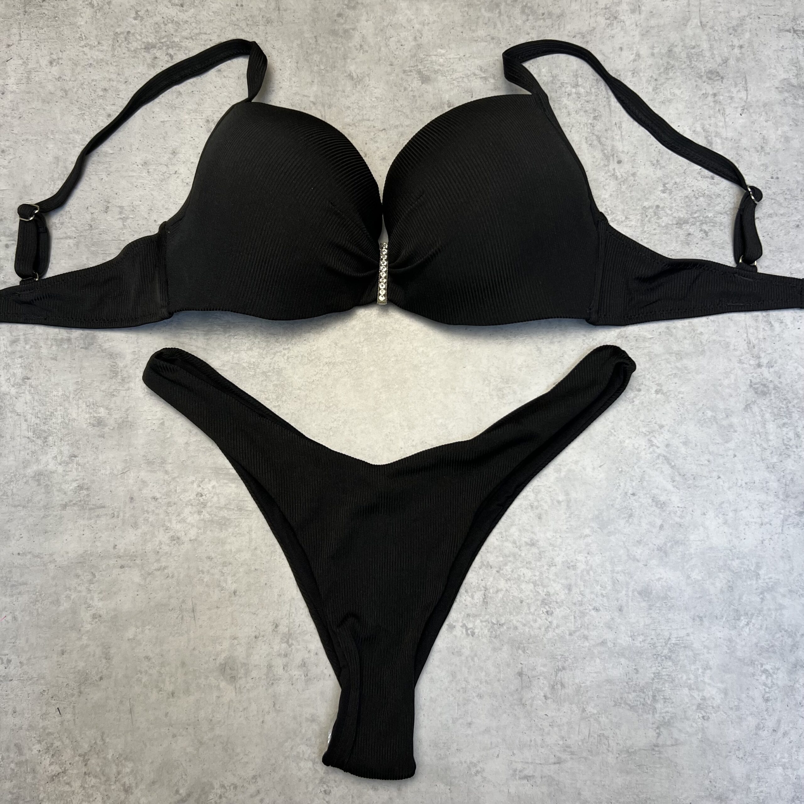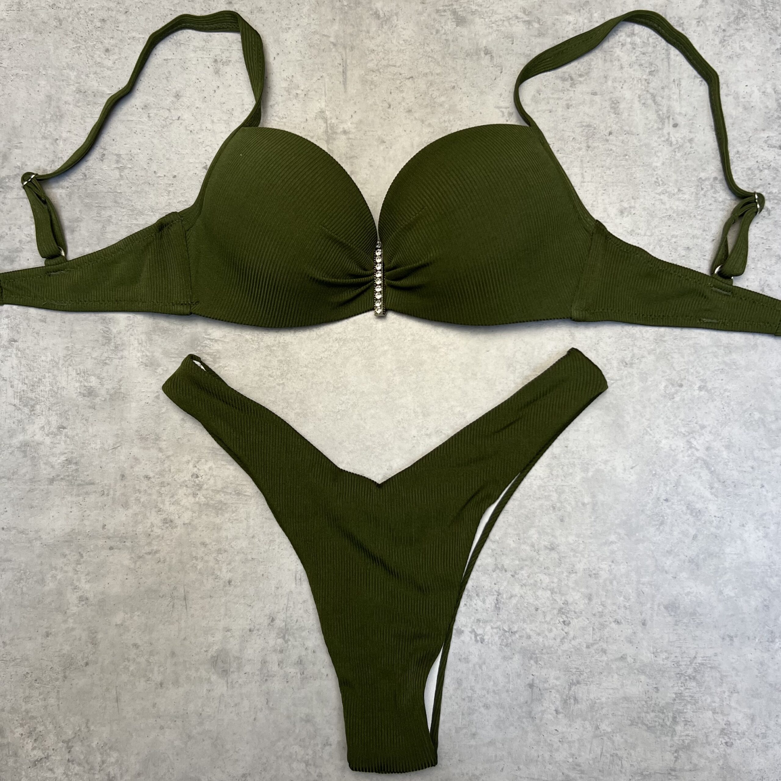 Раздельный купальник. Верх плотная чашка с пуш-аппом, бретели регулируются, на спинке завязка, декоративная брошь.