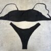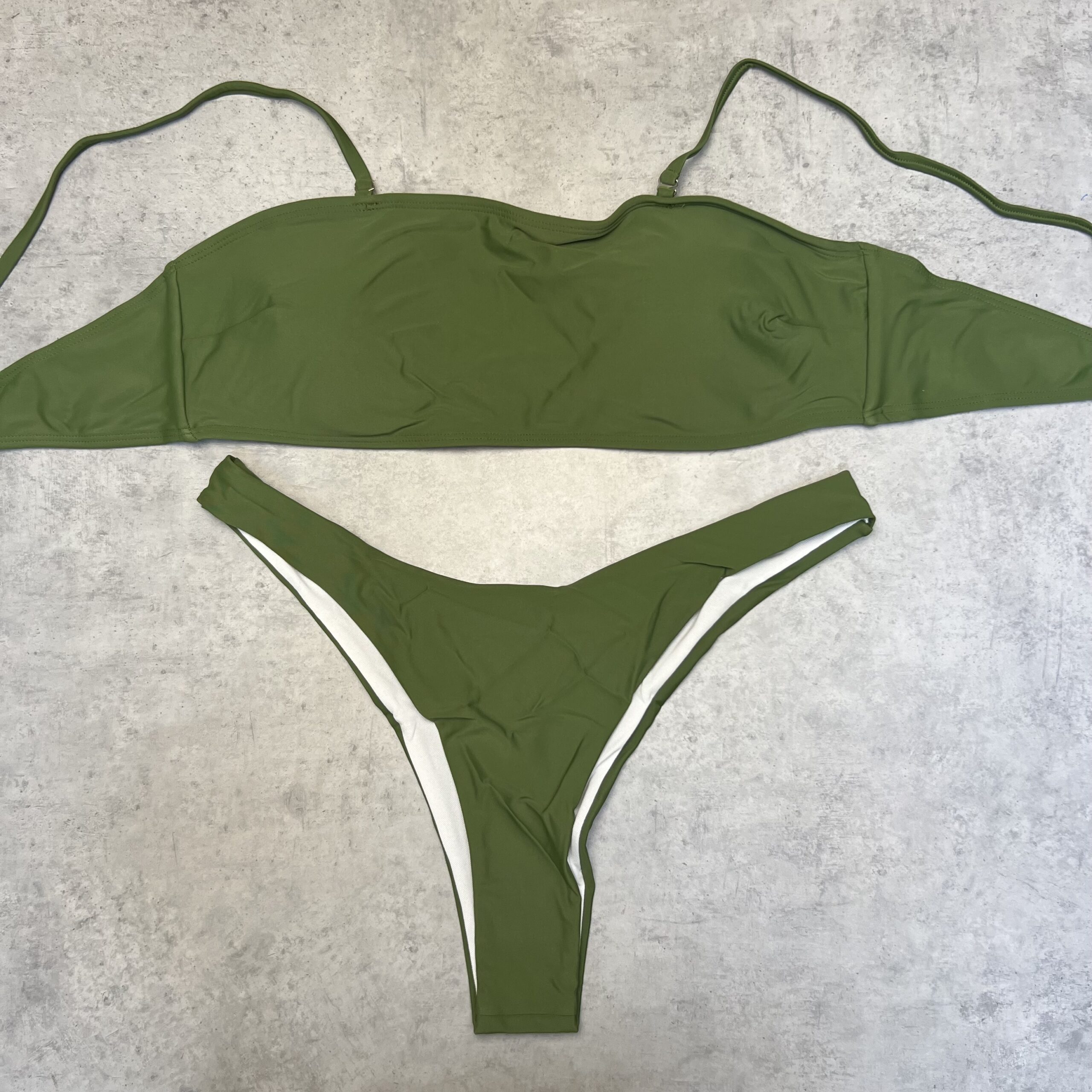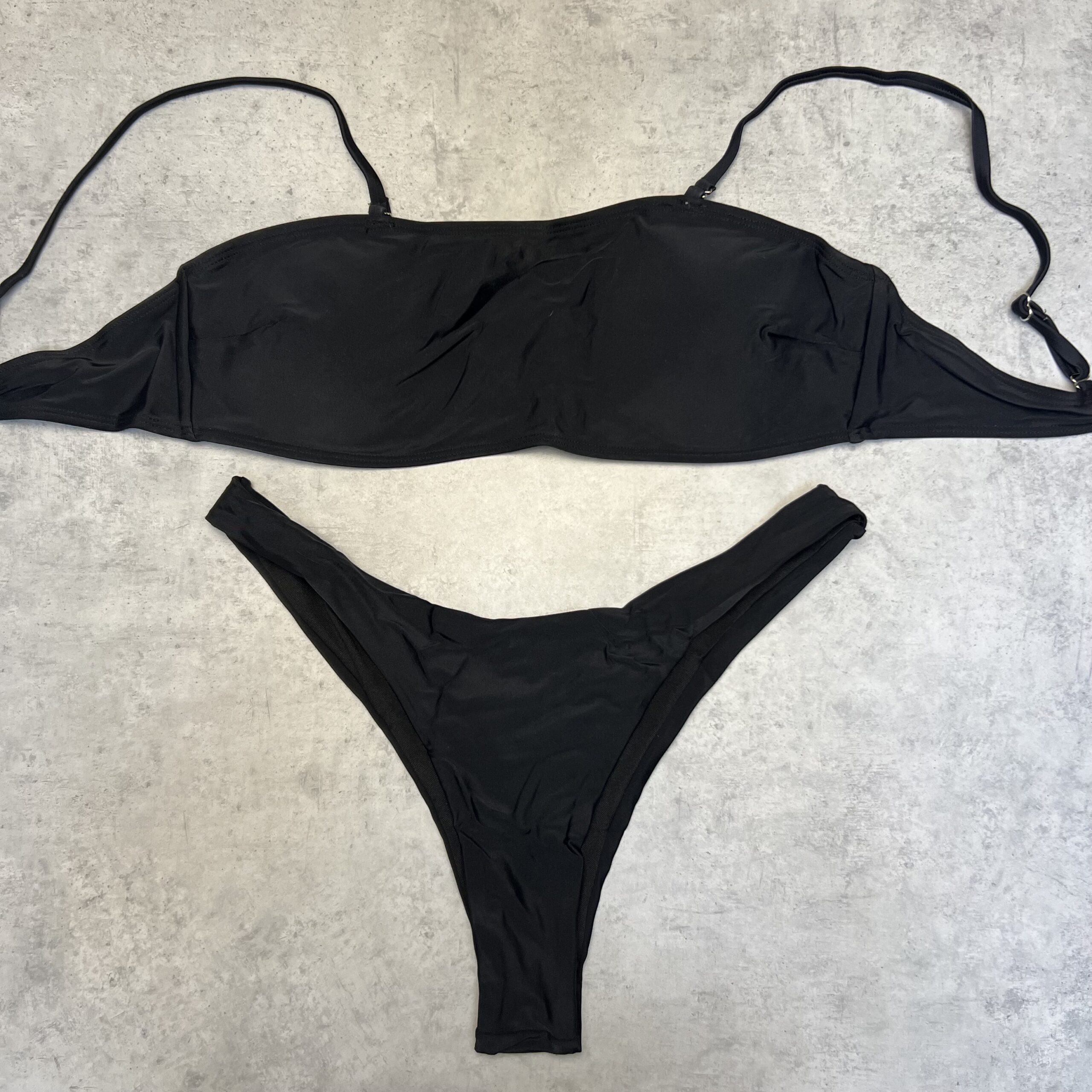 Раздельный купальник. Верх бандо, бретели отстёгиваются и регулируются, на спинке застёжка, есть вкладыши. Низ галочки.