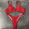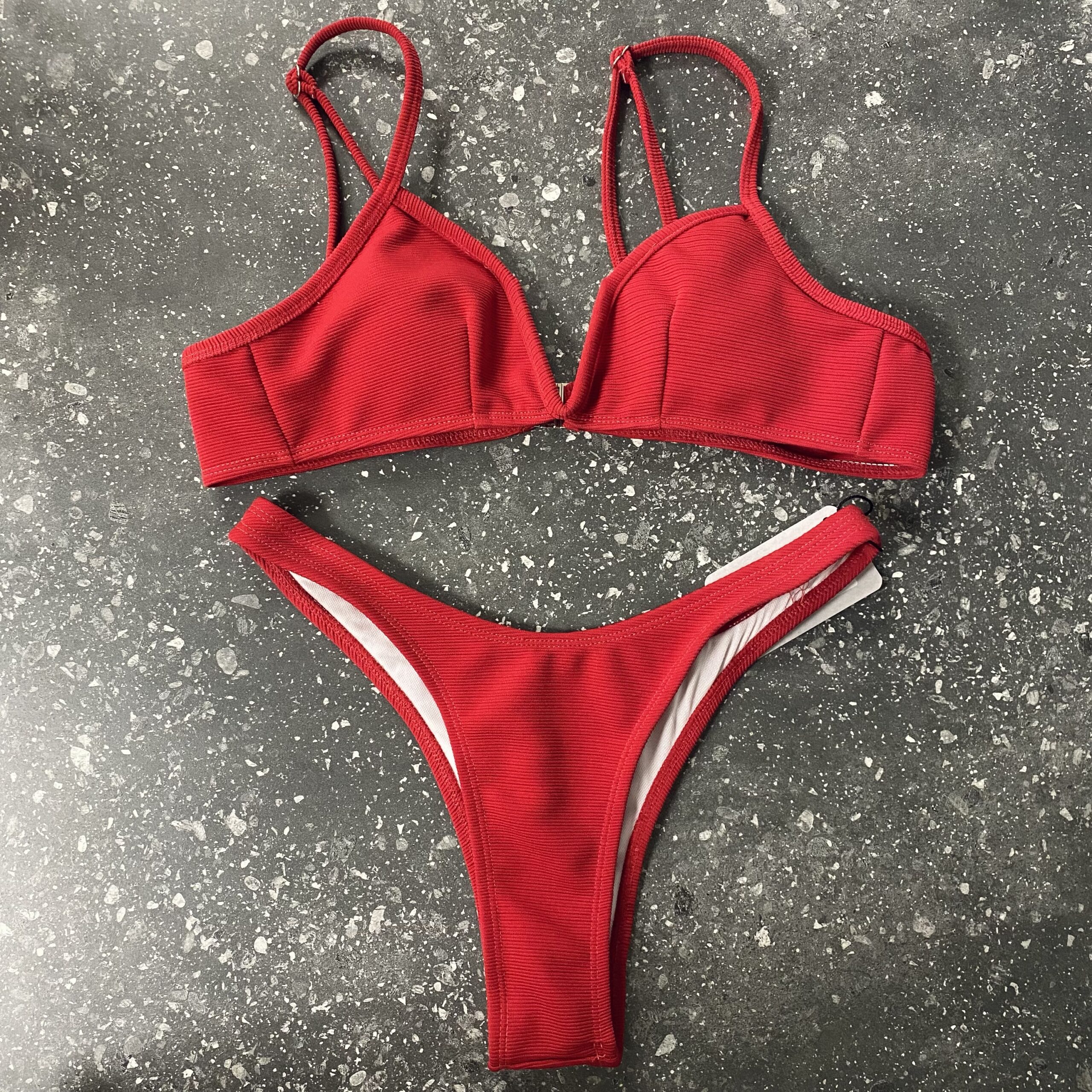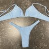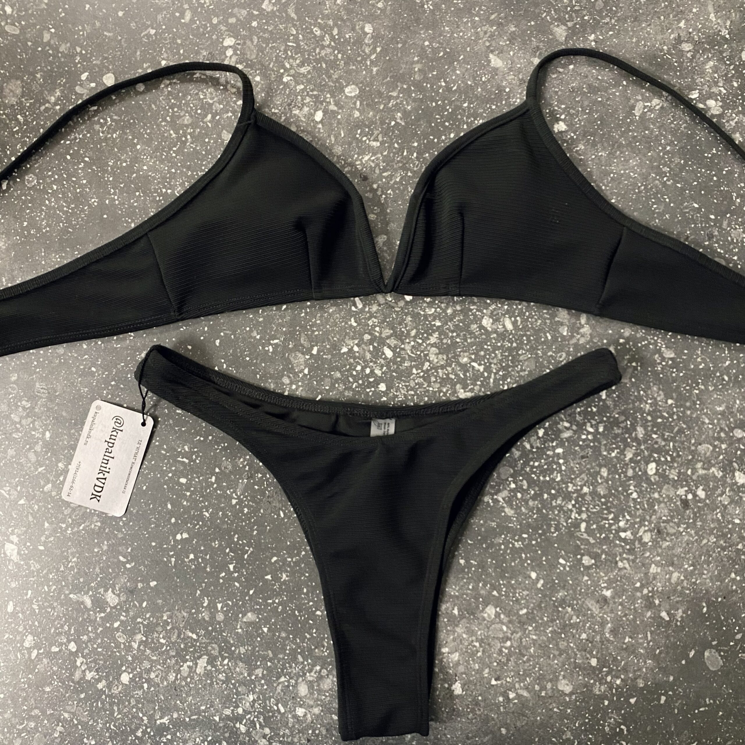 Раздельный купальник с V-образным вырезом на лифе. Верх бандо с регулируемыми бретелями, застёжка на спинке. Низ бикини.