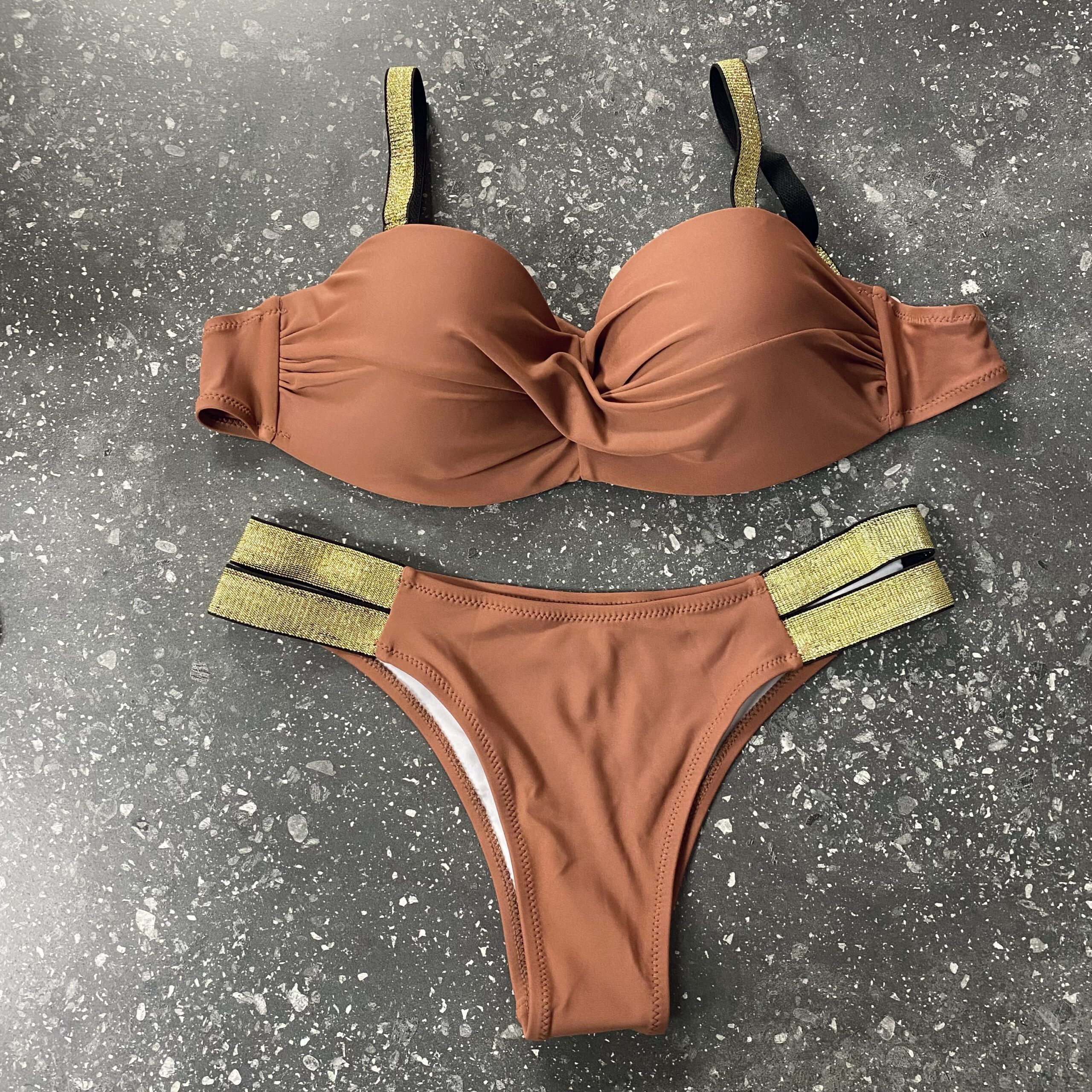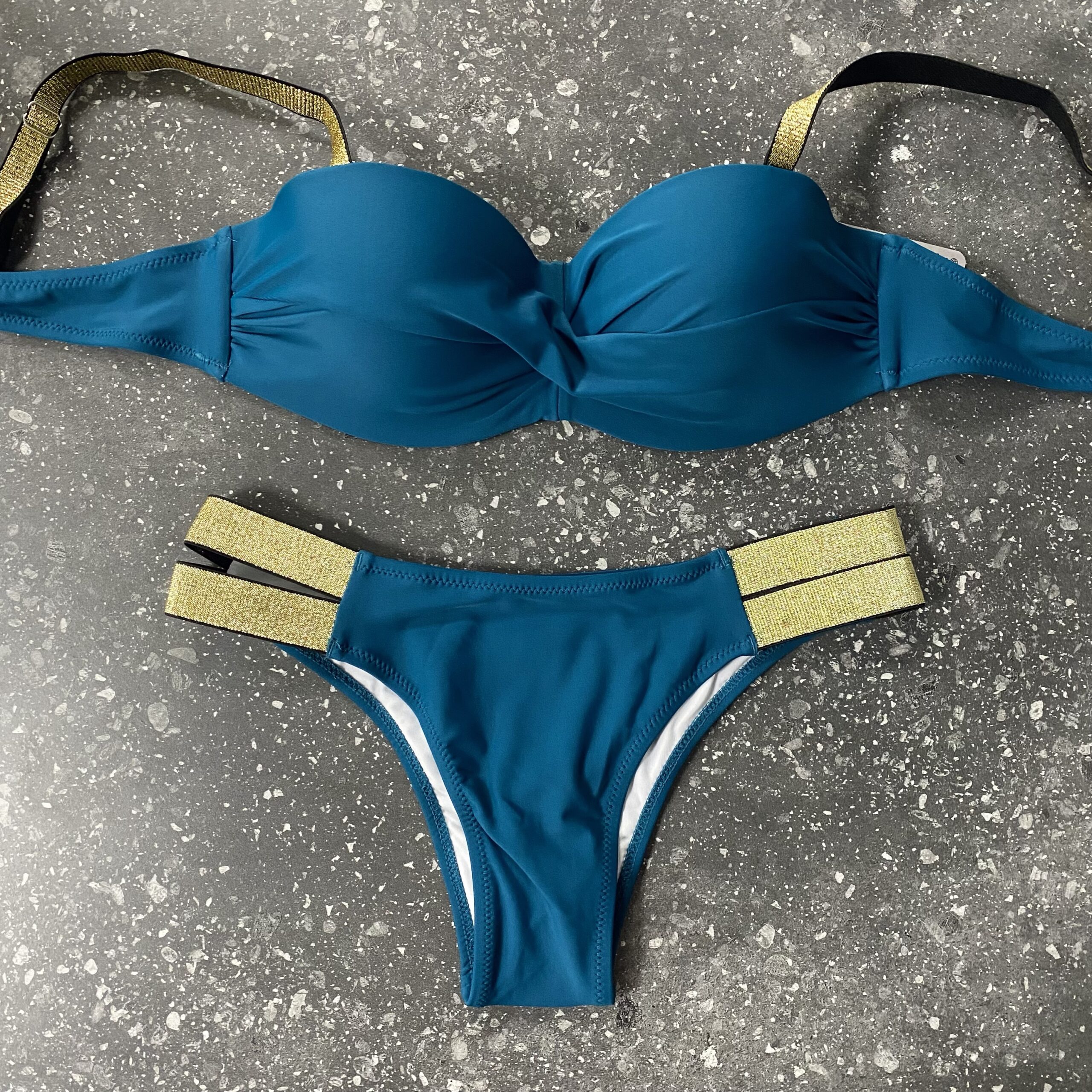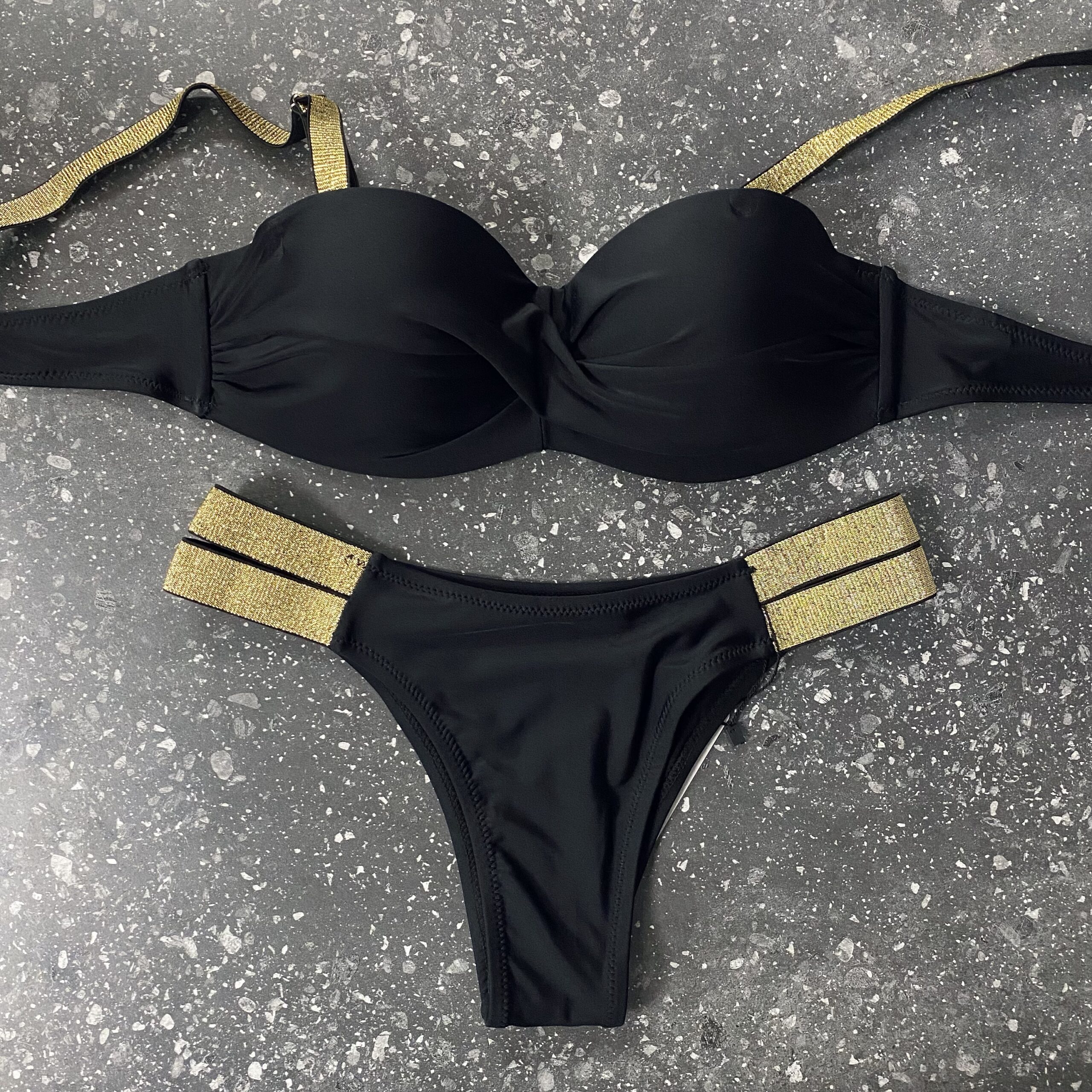 Раздельный купальник с блестящими вставками на лифе и трусиках. Верх плотная чашка, регулируемые классические бретели, завязывается на спинке. Низ бикини.