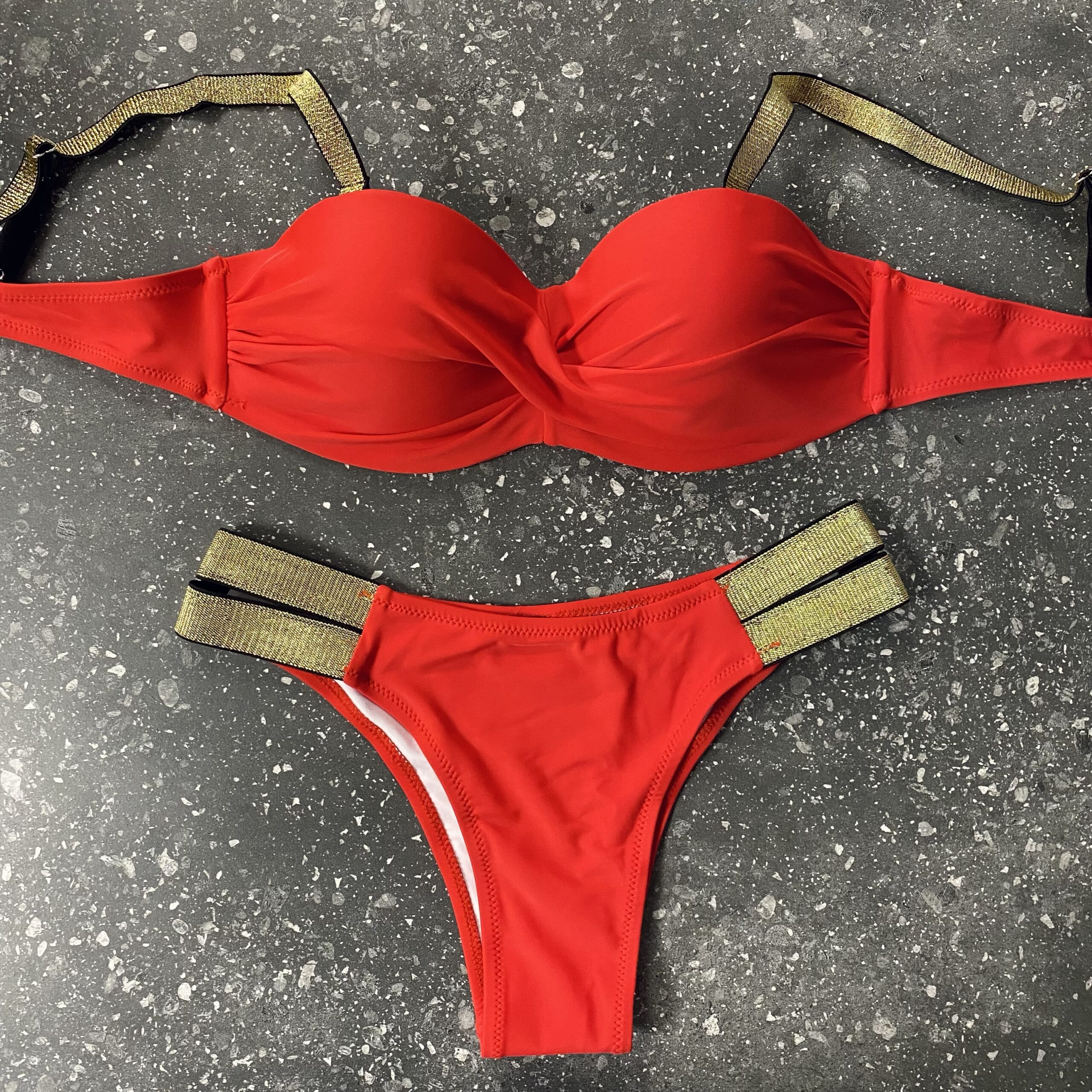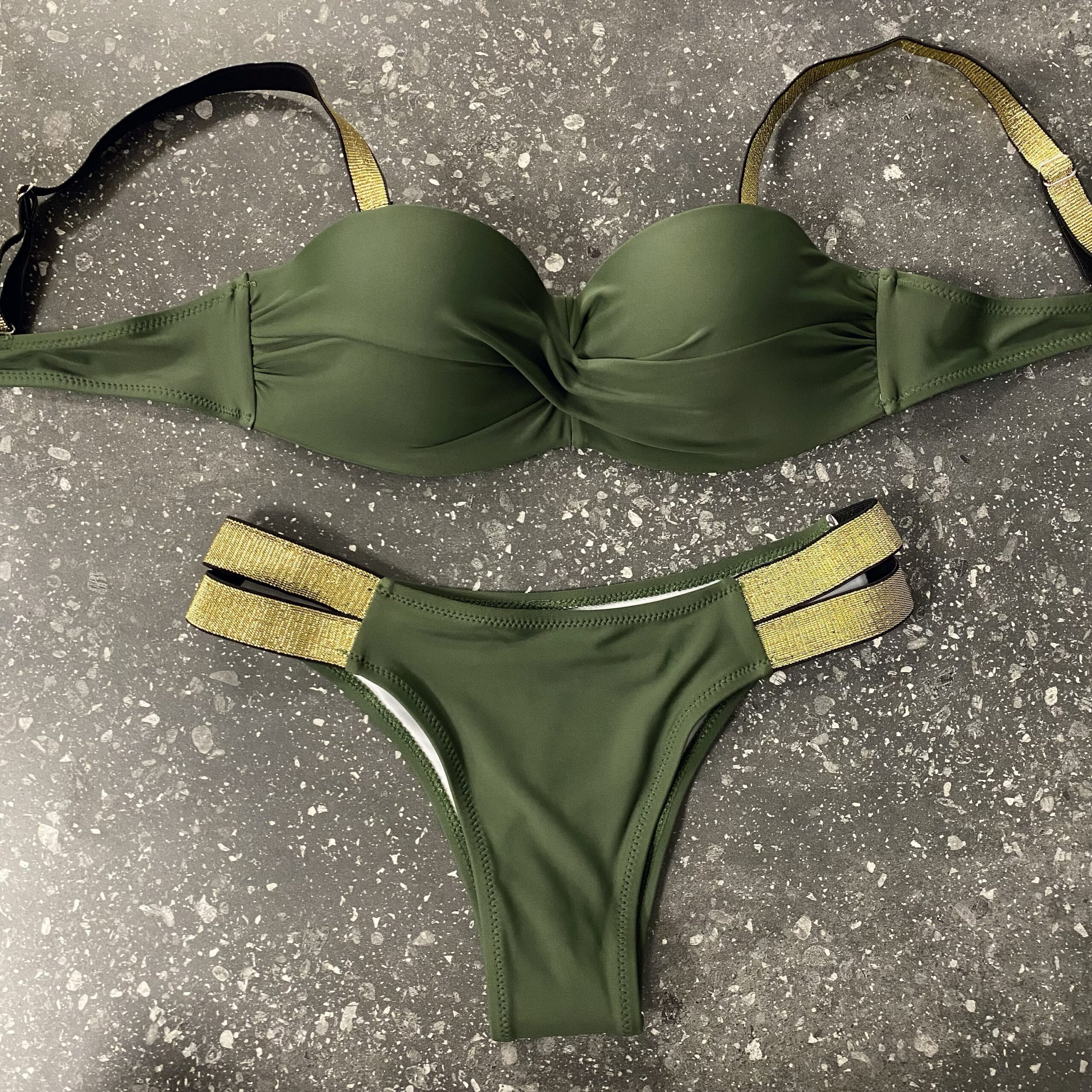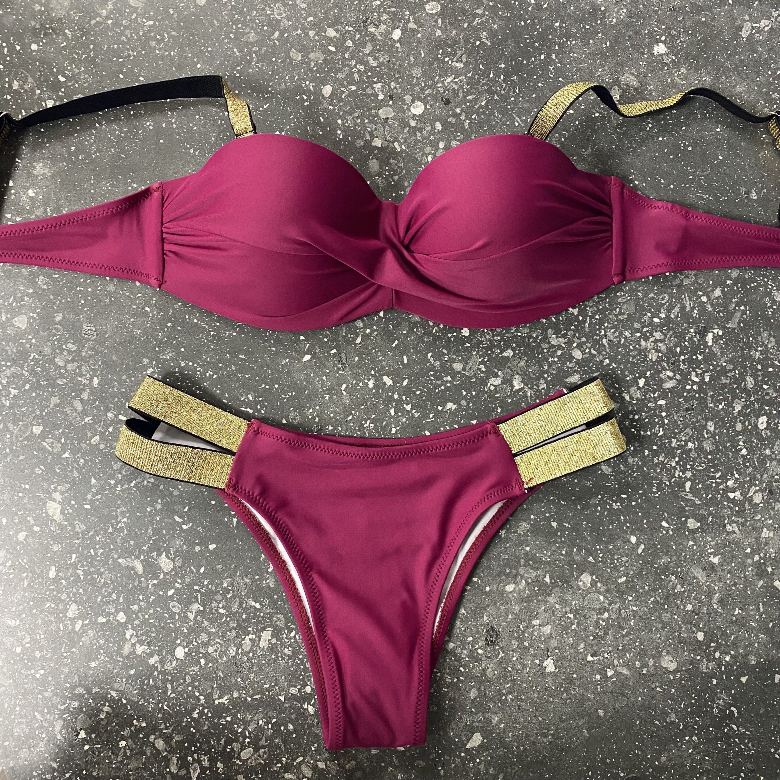 Раздельный купальник с блестящими вставками на лифе и трусиках. Верх плотная чашка, регулируемые классические бретели, завязывается на спинке. Низ бикини.