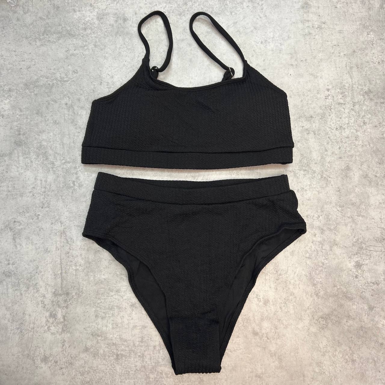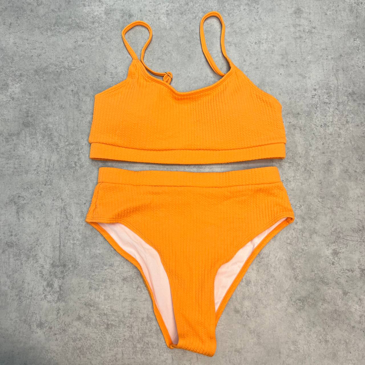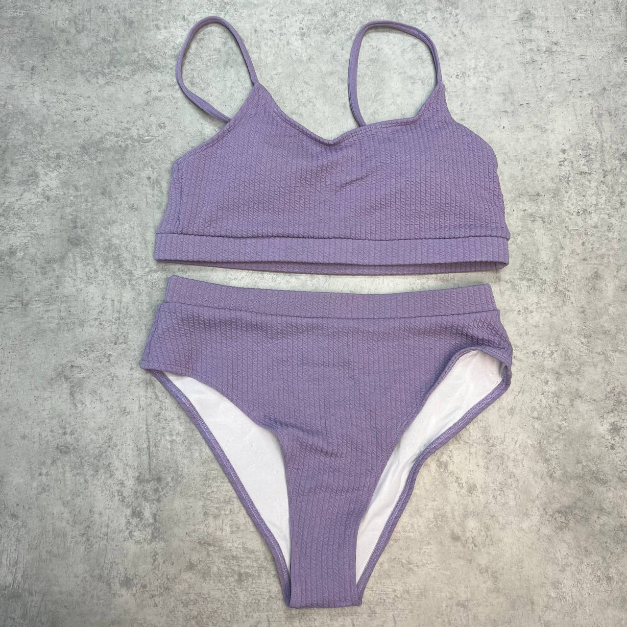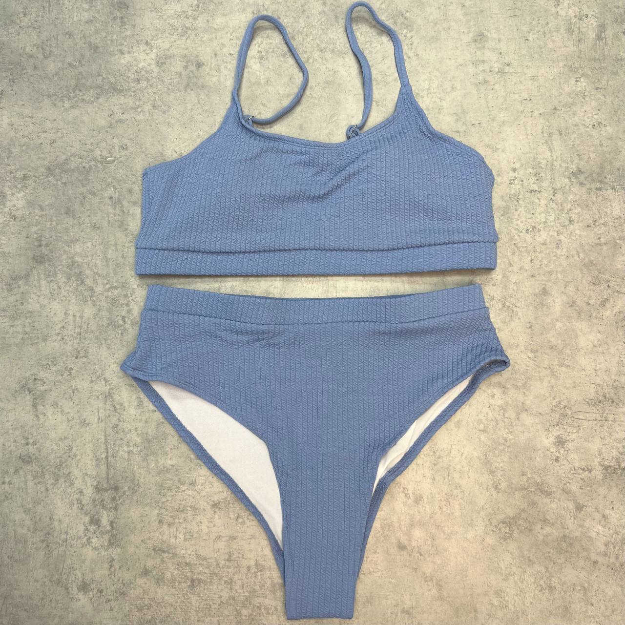 Раздельный купальник. Верх топ на регулируемых бретелях, есть вкладыши. Низ завышенные бикини.