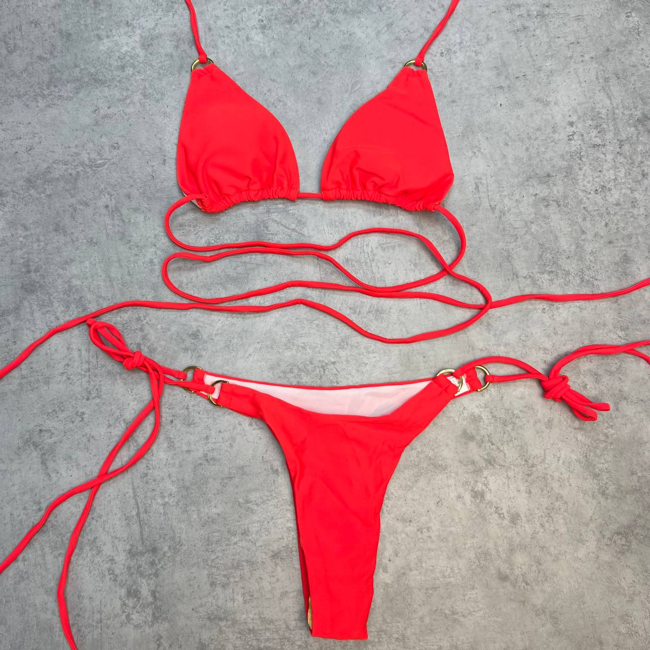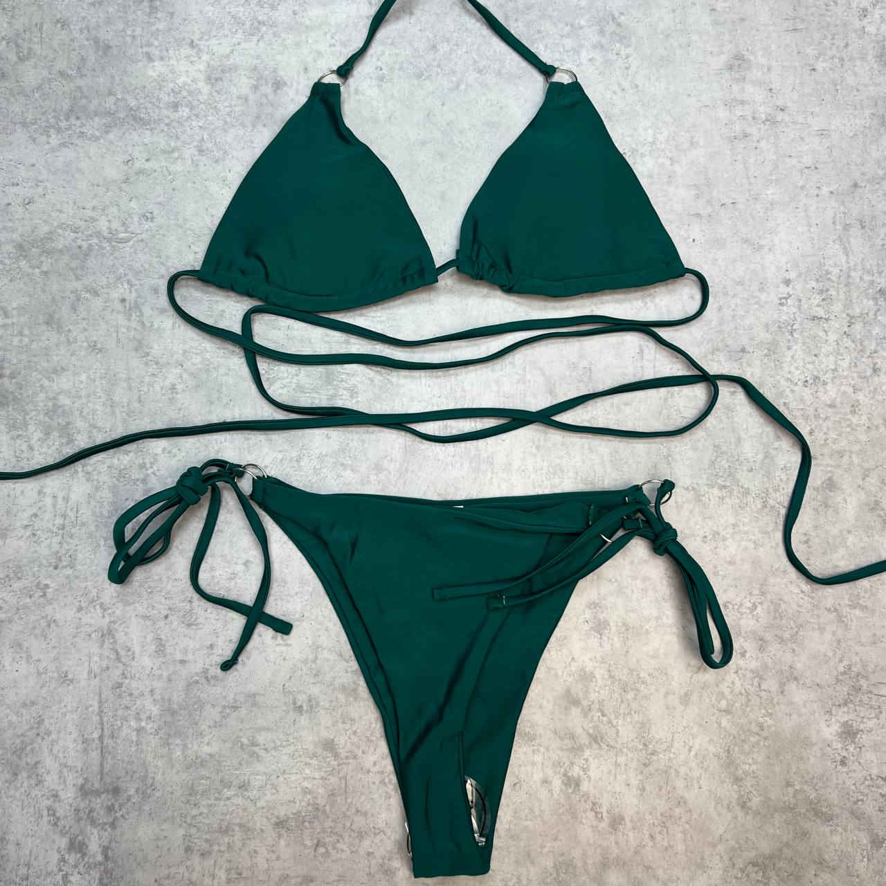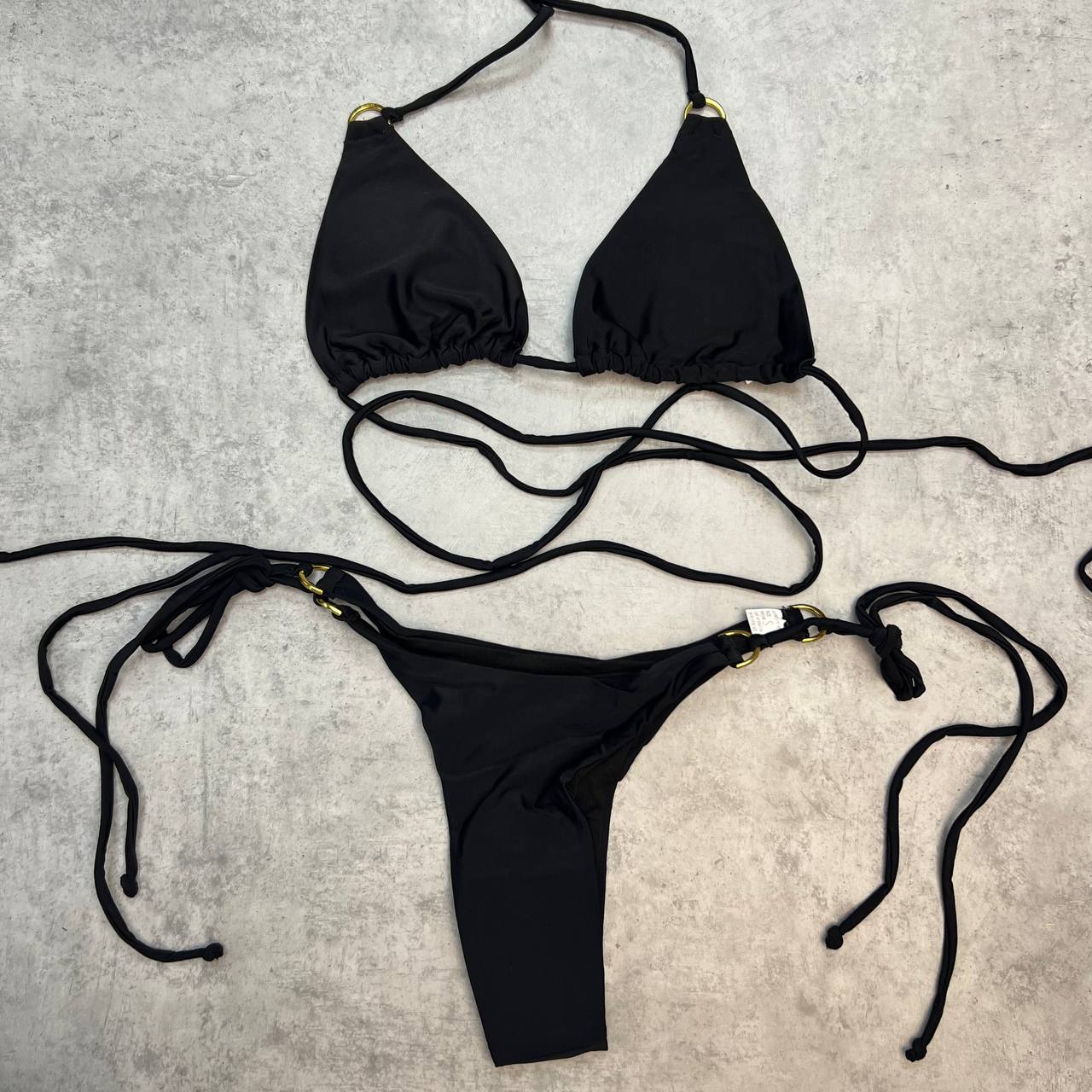 Раздельный купальник. Верх «треугольники-шторки» с завязками вокруг шеи и длинными завязками вокруг талии. Низ бикини с завязками по бокам.