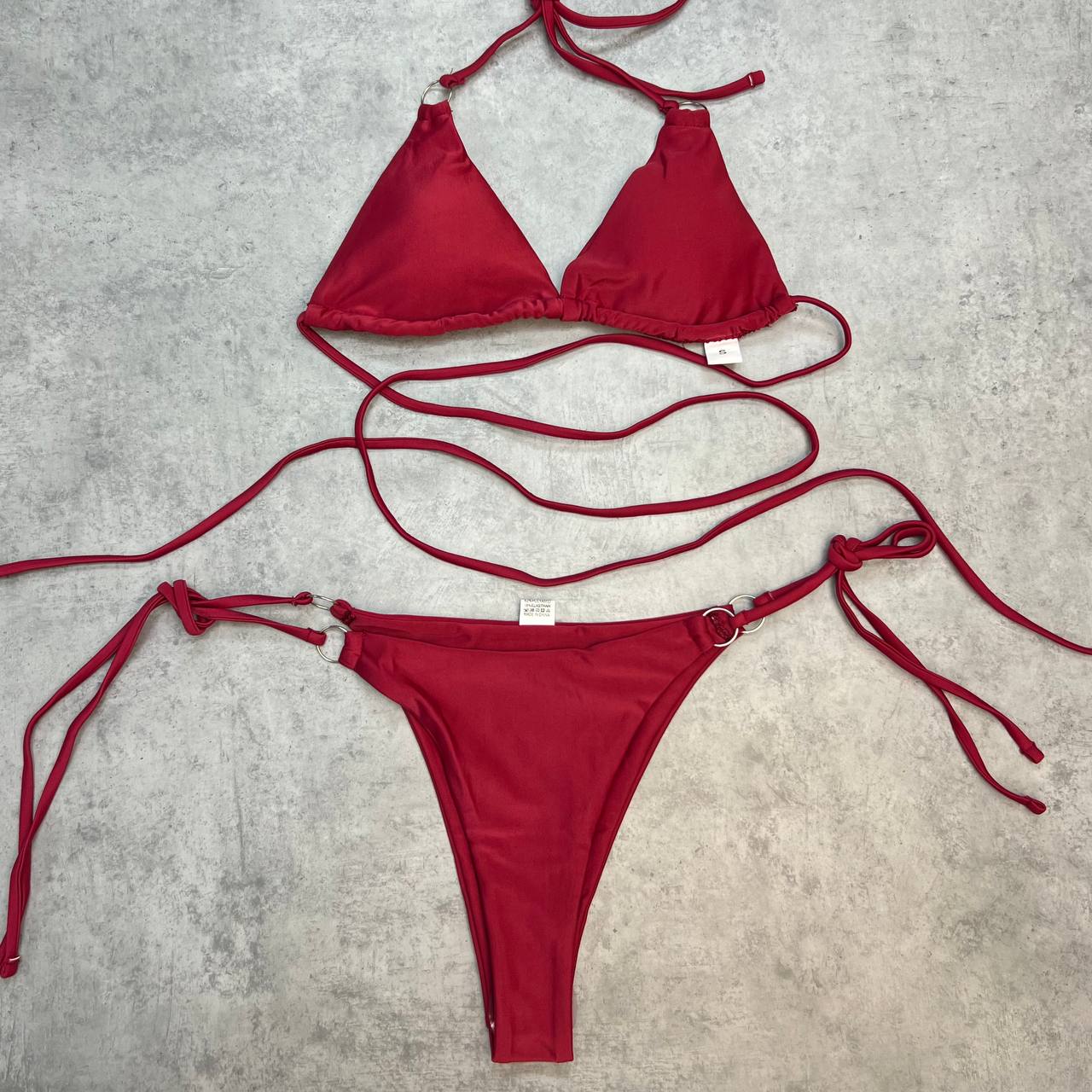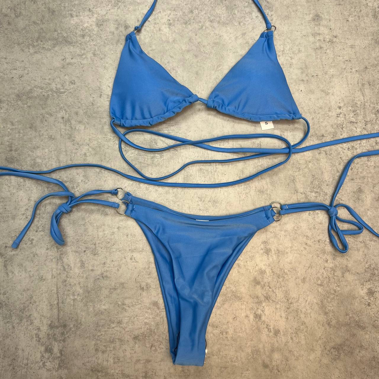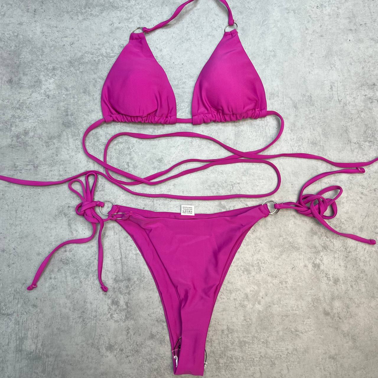 Раздельный купальник. Верх «треугольники-шторки» с завязками вокруг шеи и длинными завязками вокруг талии. Низ бикини с завязками по бокам.
