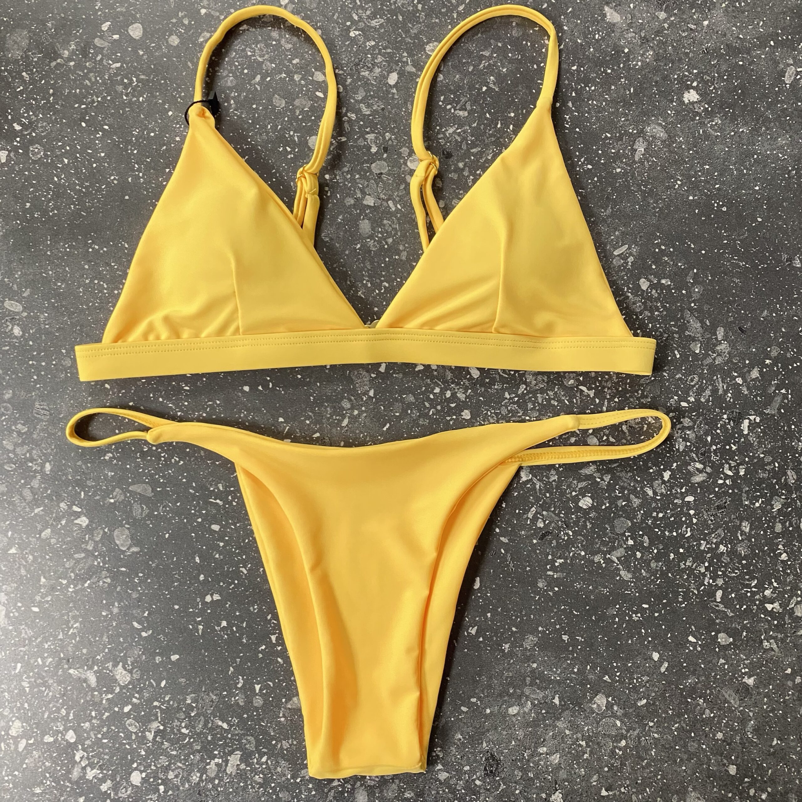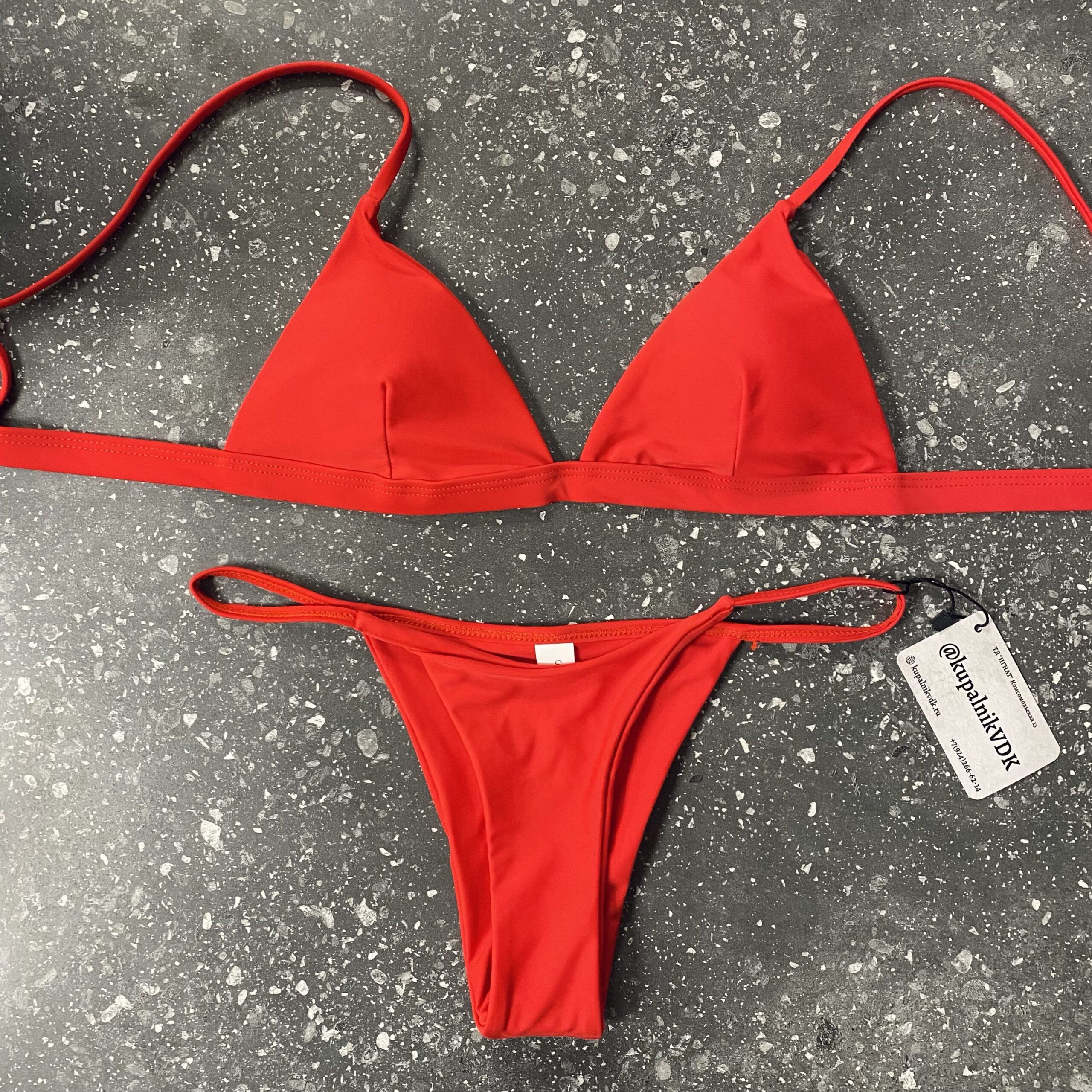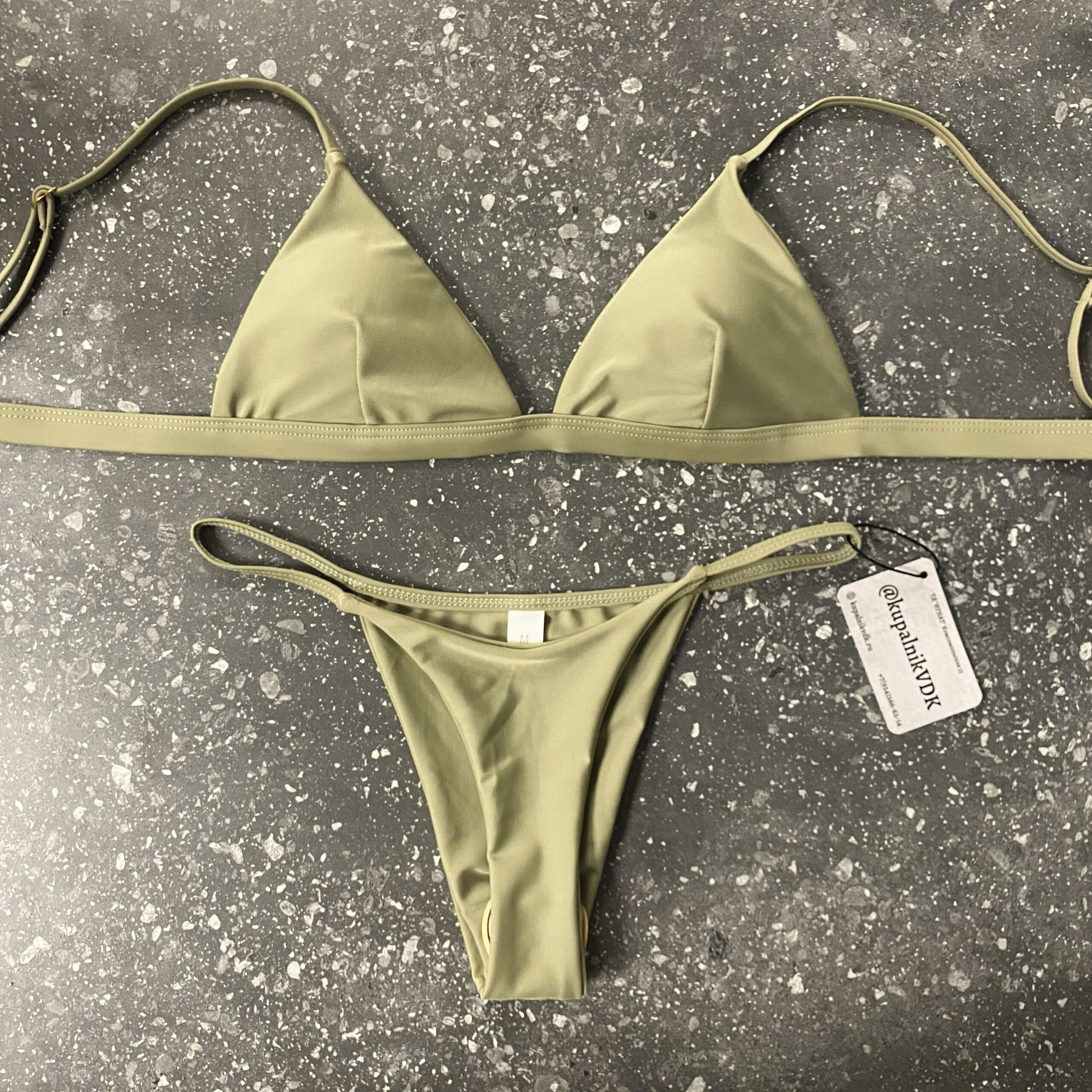 Раздельный купальник. Верх треугольной формы, регулируемые бретели, застёжка на спинке, есть вкладыши. Низ бикини.