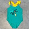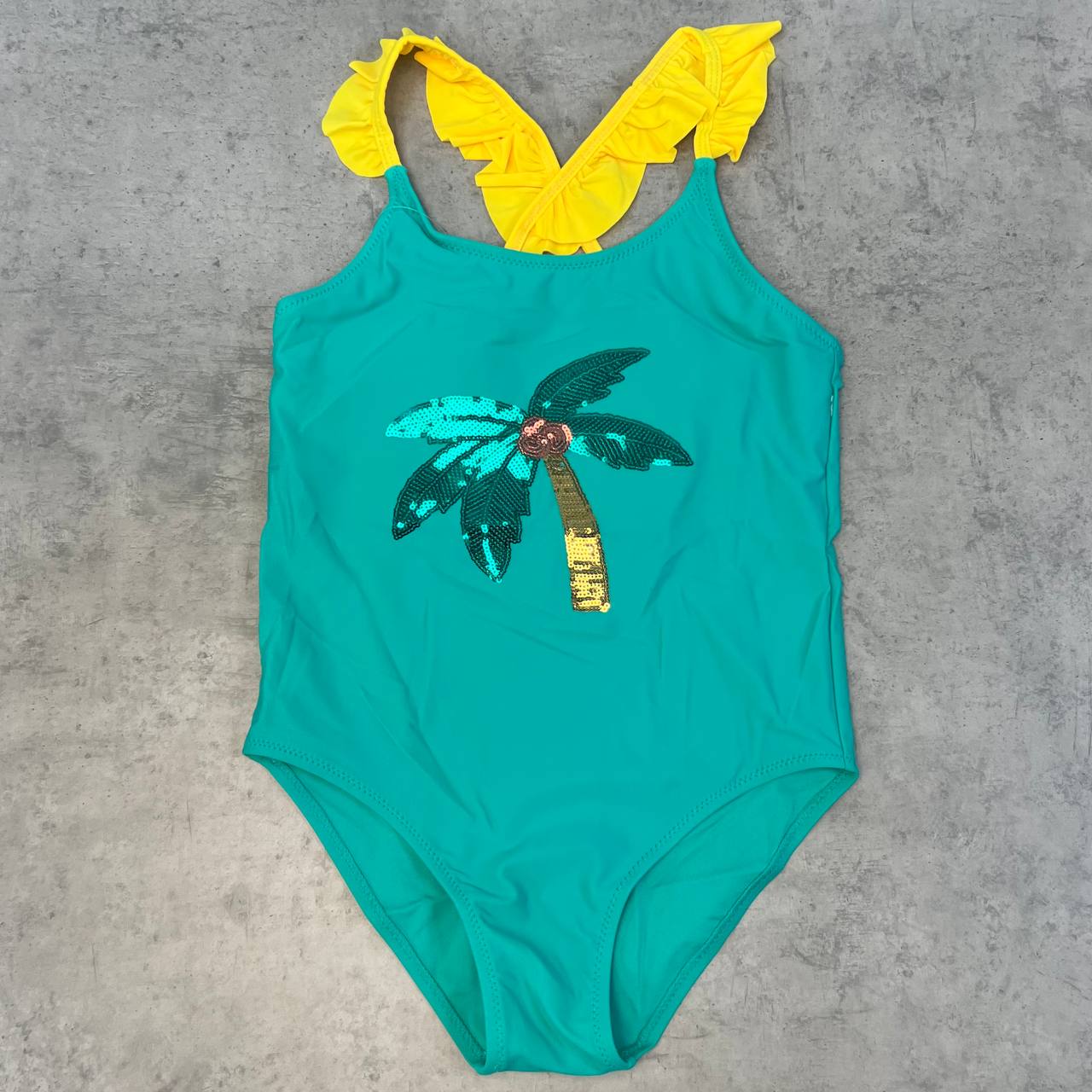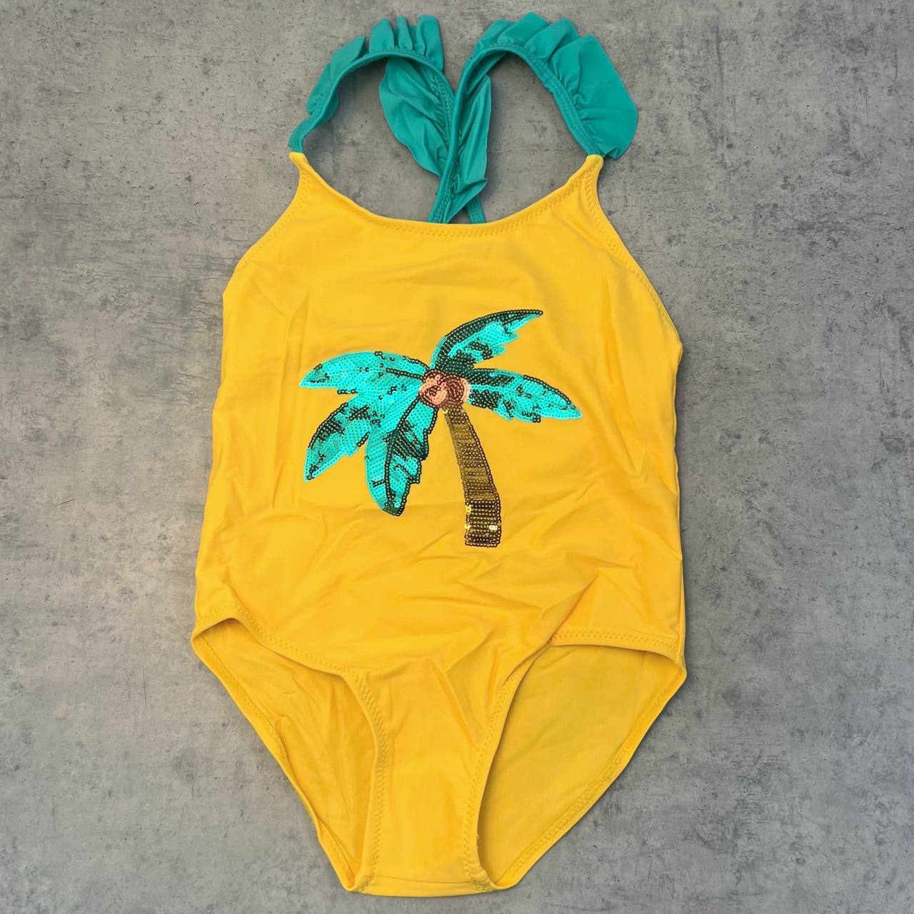 Слитный детский купальник с кружевом на бретелях и декоративным рисунком из паеток на животе.