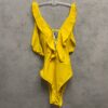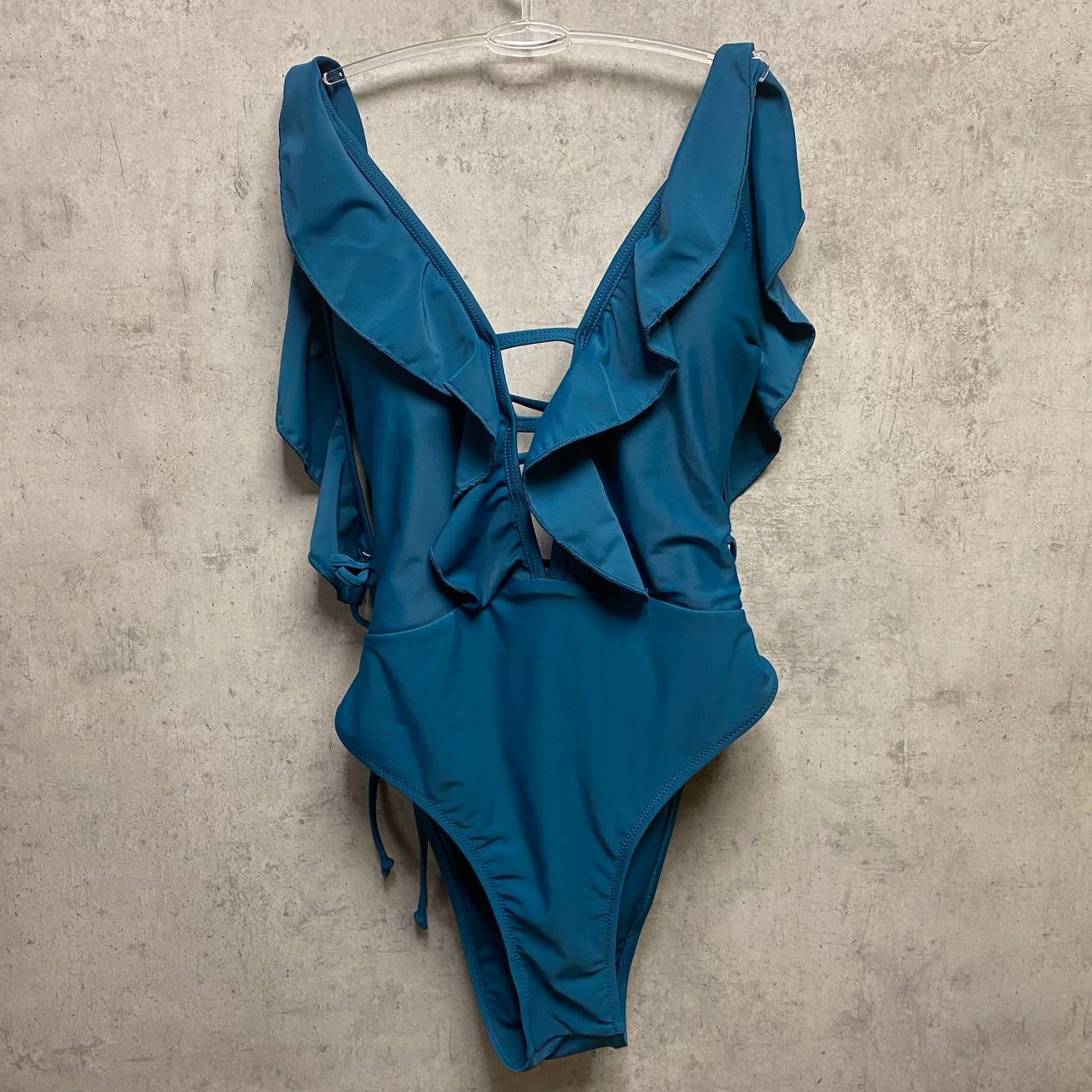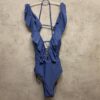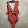 Слитный купальник с глубоким вырезом и декоративной рюшей на груди. На спинке шнуровка.