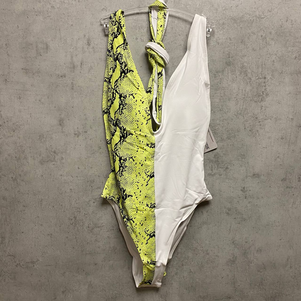 Слитный купальник с глубоким вырезом на груди, змеинный принт, бретели обвязываются вокруг тела, открытая спинка, есть вкладыши.
