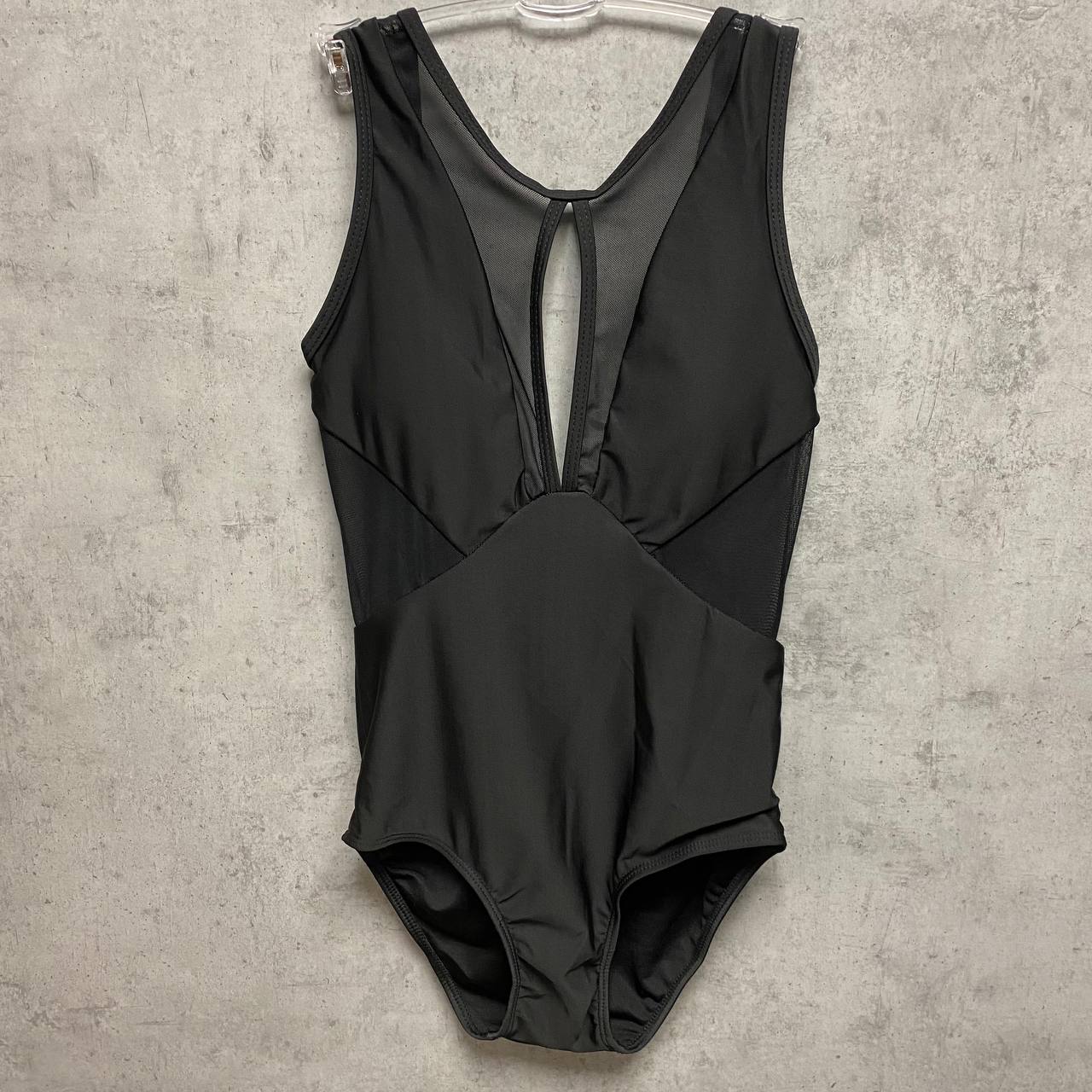 Слитный купальник, вырез на груди, по бокам и на спинке вставки из сетки, есть вкладыши.